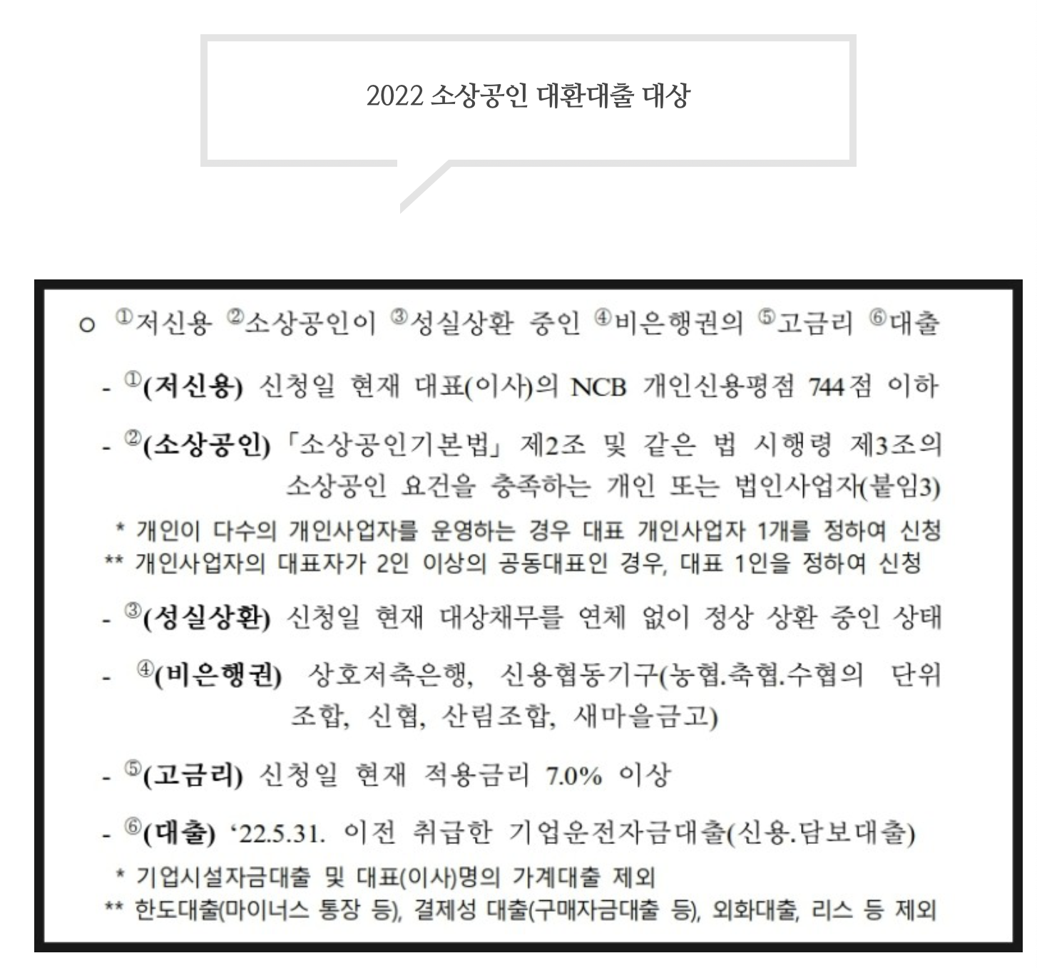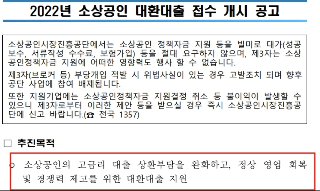 저신용자(NCB 신용점수 744점 이하) 소상공인으로 연 7%이상의 비은행권 고금리대출을 저금리 정부 정책자금으로 전환해주는 사업이며 소상공인들의 7%이상 고금리 상환 부담완화를 목적으로 하고있다.