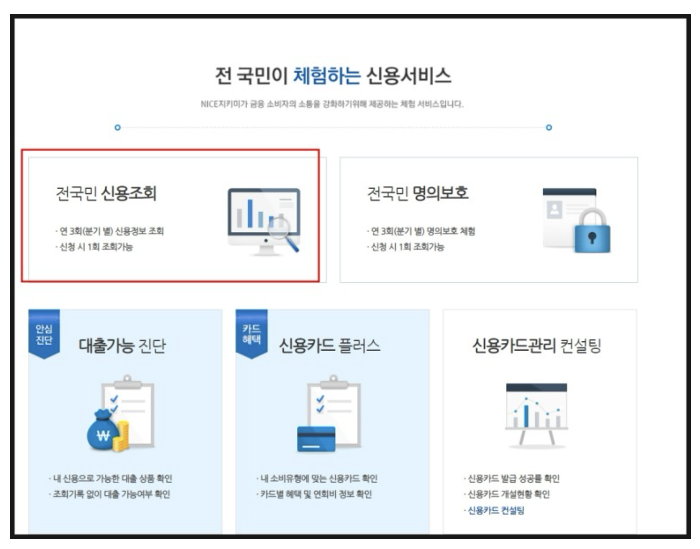 여기서 전국민 신용조회 버튼을 누르면 무료로 조회 가능하다.