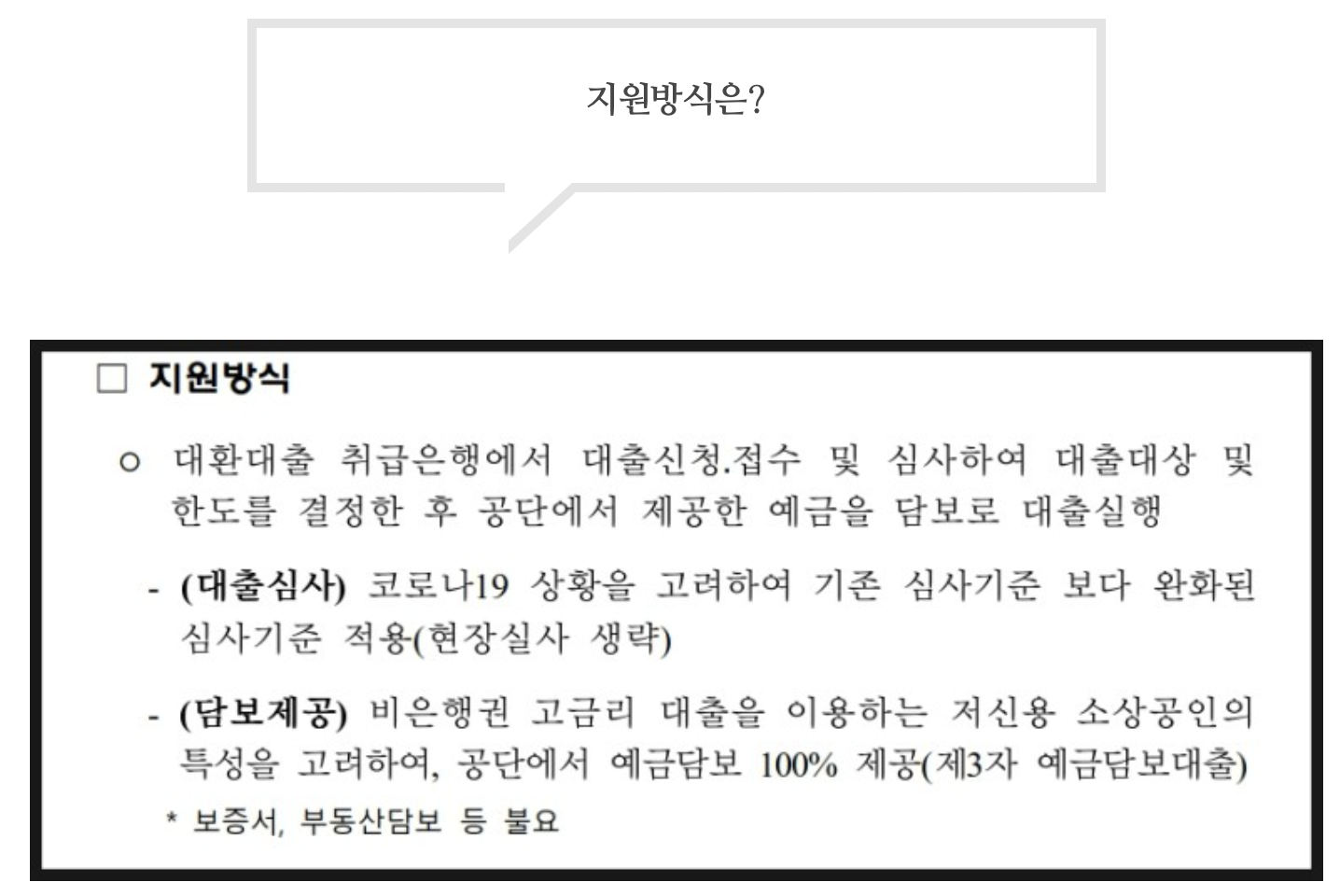 제3자 예금담보대출 형식으로 진행된다. 취급은행에서 대출신청, 접수 및 심사 이후 한도를 결정한 후 공단에서 제공한 예금을 담보로 대출실행하게 된다.