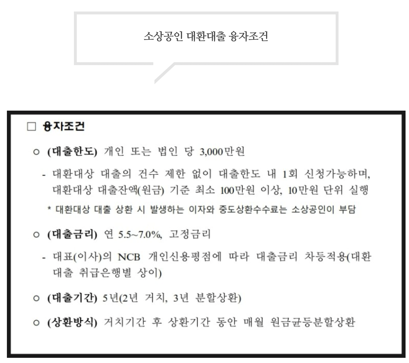 연 5.5%-7% 고정금리이며, 대표자의 NCB개인 신용평가점수에 따라 금리도 차등적용된다. 기간은 5년짜리 상품이며 거치기간 후 상환기간동안 매월 원금균등분할상환이다.