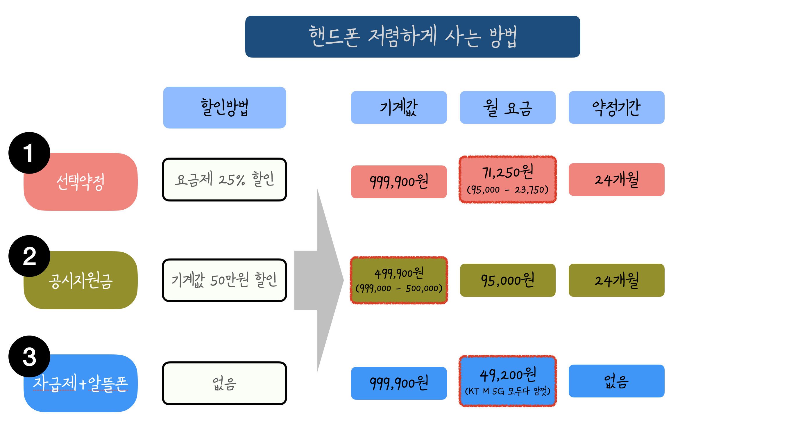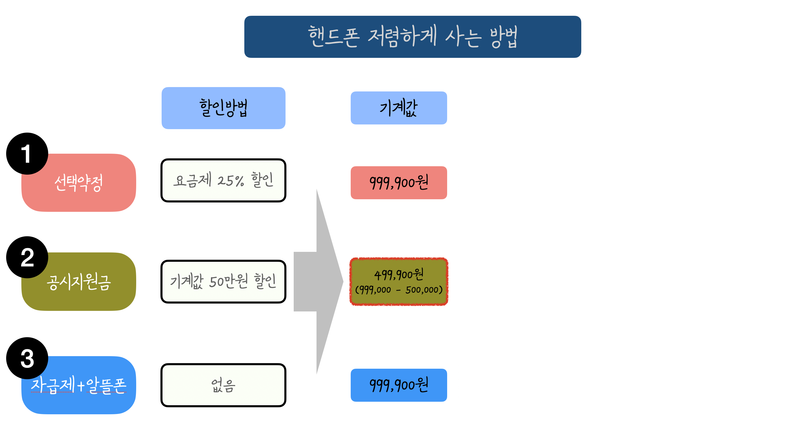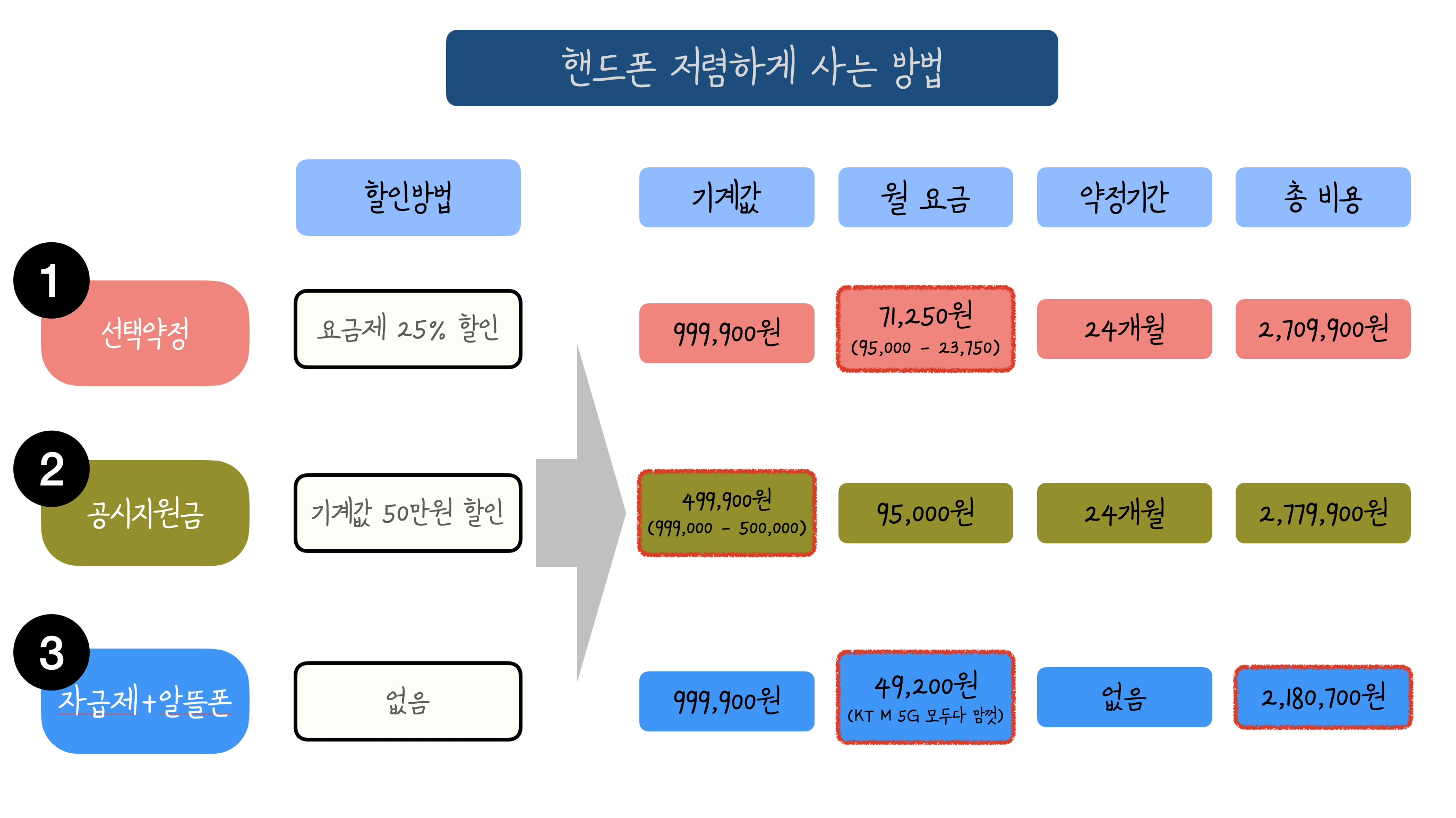 선택약정, 공시지원금, 자급제+알뜰폰을 비교해보도록 하겠습니다.
