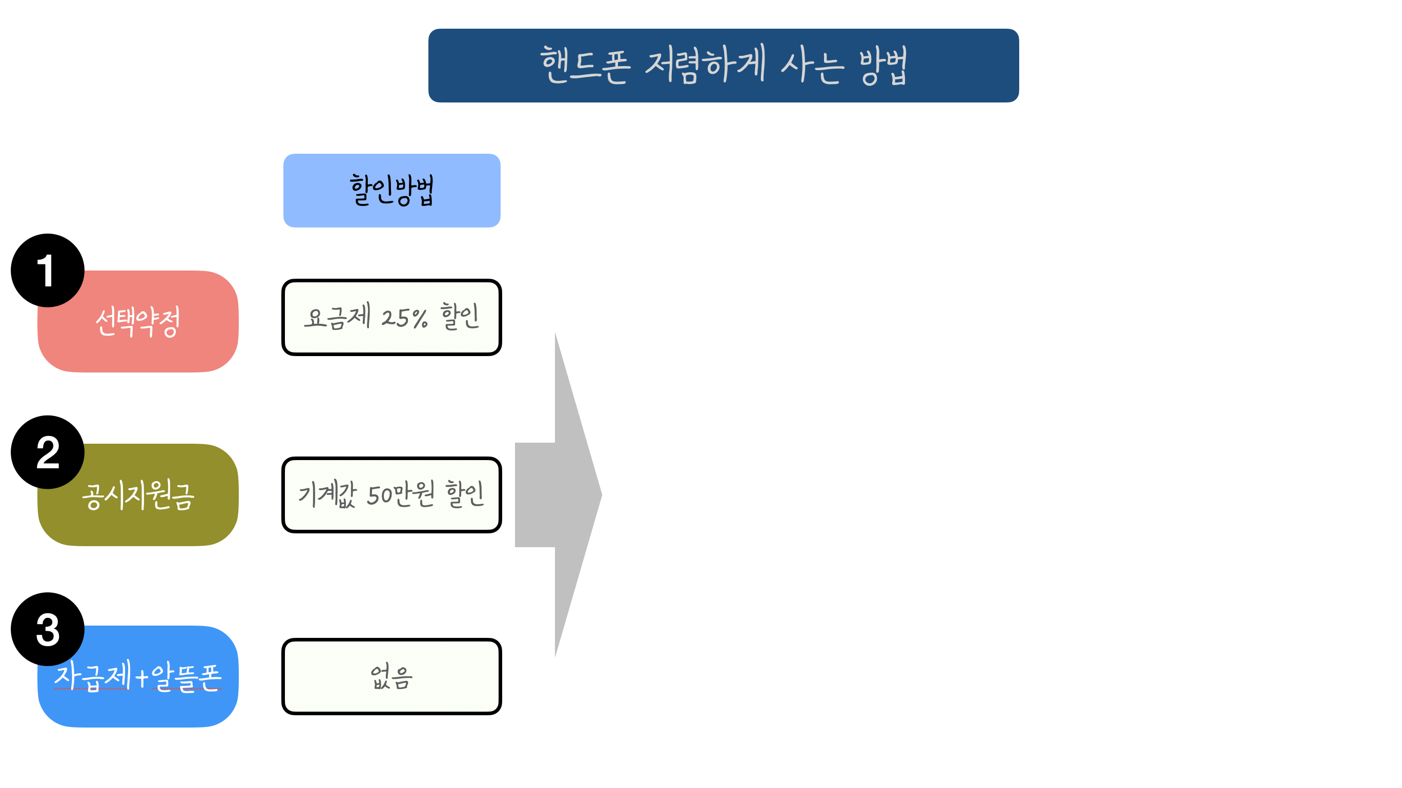 3. 할인 : 공시지원금(살 때 바로 기계 값 할인), 선택약정(요금제에서 25%를 할인 해주는 것)