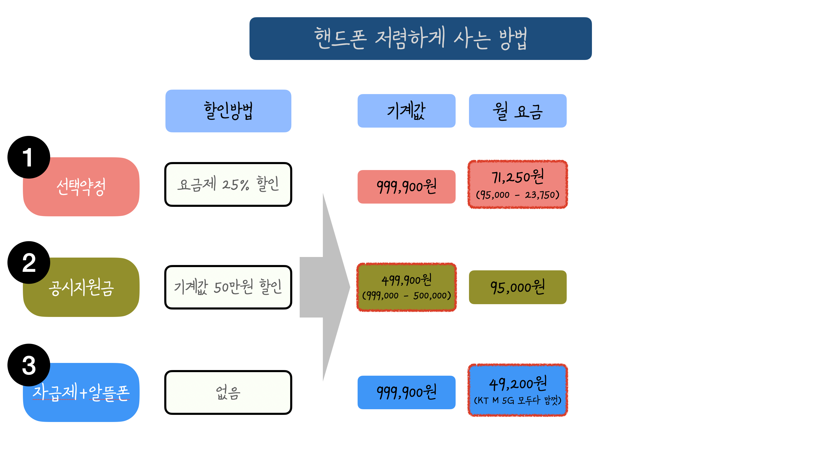 선택약정, 공시지원금, 자급제+알뜰폰을 비교해보도록 하겠습니다.