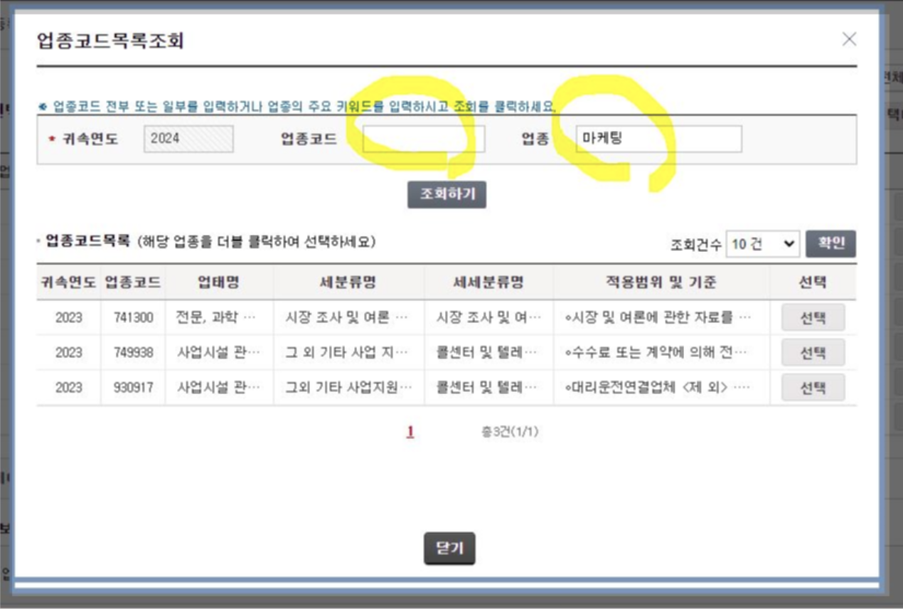 4. 업종코드 검색을 누르면 위와같이 창이 뜬다. 업종코드나 업종명을 직점 검색한다.