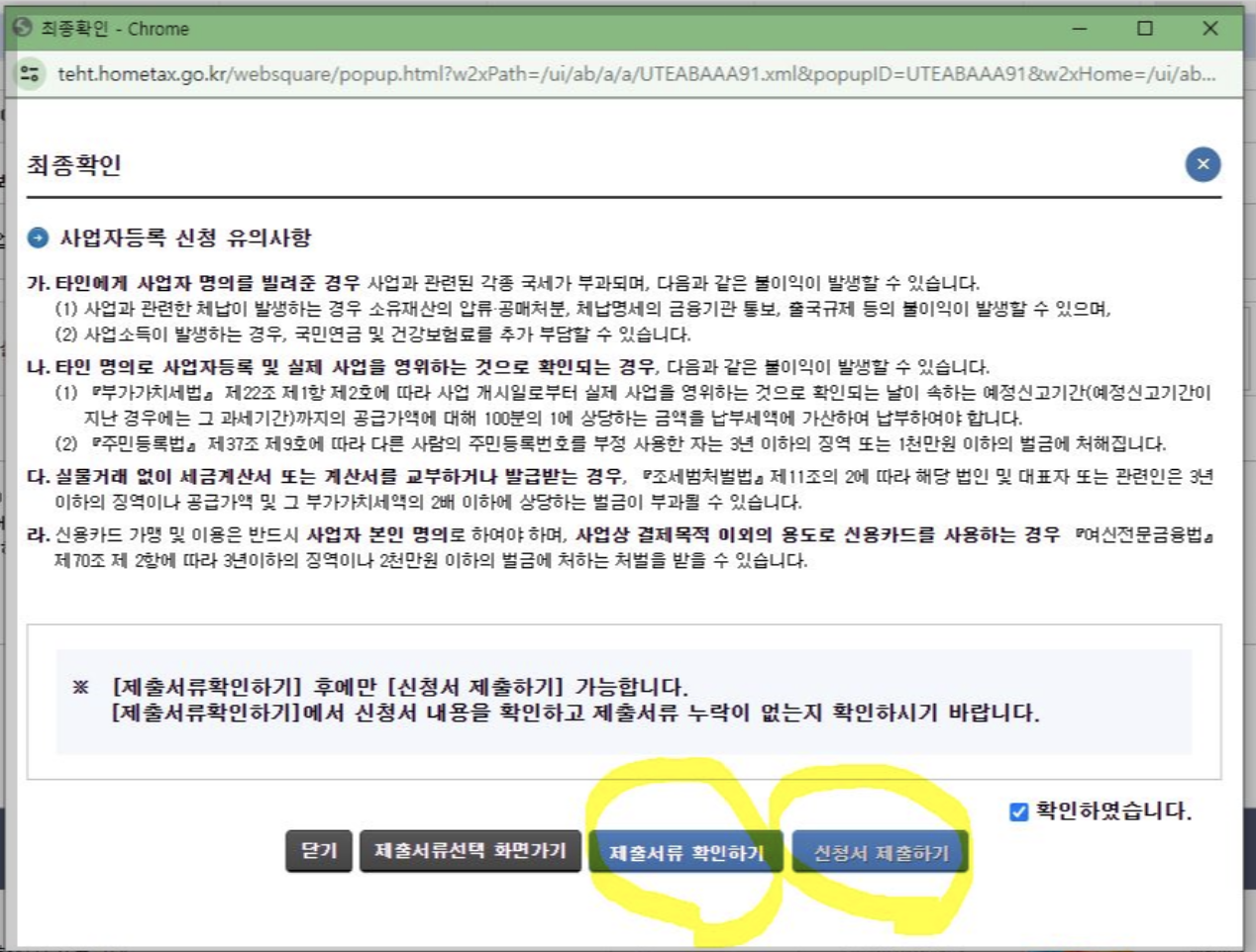 7. 아래로 내리면 위와같이 본인이 추가한 업종과 업태를 확인할 수 있습니다. 여기서 제출서류에 확인하기를 누르면 필요 서류를 알 수 있습니다. 여기서 새로 추가하거나 변경한 업종과 업태는 반드시 업종코드를 기억하세요.