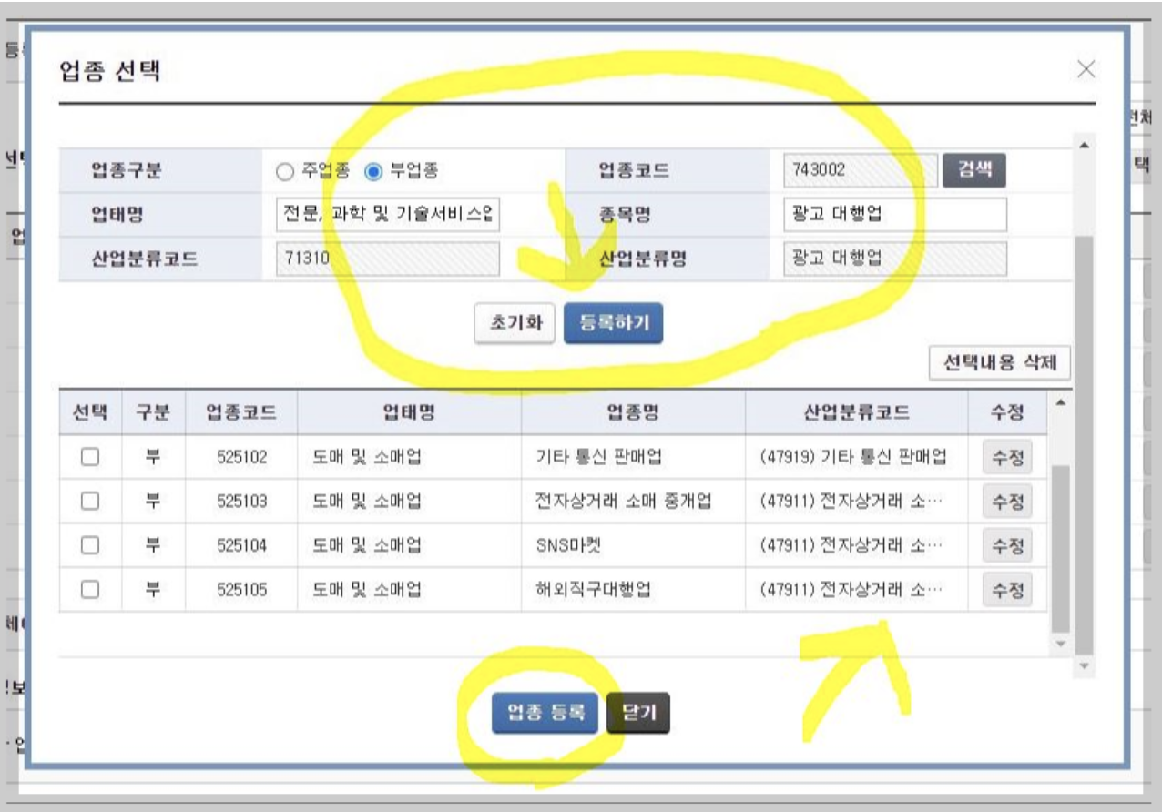 6. 그럼 위처럼 자동으로 입력되어집니다. 등록하기 버튼을 누르고 아래 목록에 추가된 것을 확인했다면, 업종 등록 버튼을 누르면 창이 닫힙니다.