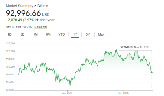 - 비트코인은 올해 10월 초 약 US$ 126,000 수준에서 고점 이후, 최근 약 US$ 90,000대까지 하락했으며 이는 약 25~30% 수준의 하락을 의미합니다. 모닝스타+4Cryptohopper+4조선일보+4