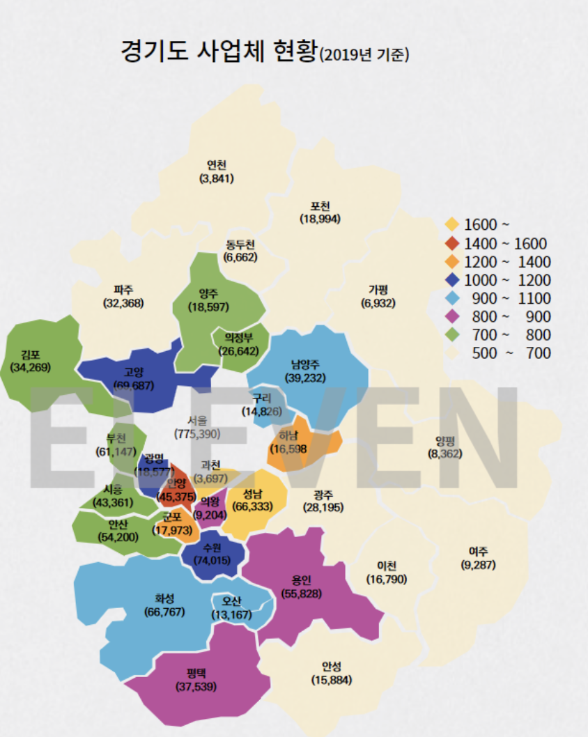 사진에서 알 수 있듯이 서울 남부지역으로 기업체들이 뻗어나가고 있는 걸 볼 수 있다.